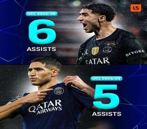巴黎圣日耳曼在欧冠半决赛首回合主场5-4战胜拜仁慕尼黑,阿什拉夫本场助攻克瓦拉茨赫利亚破门。至此,阿什拉夫本赛季欧冠助攻数达到6次,他也成为欧冠历史上唯一一位连续两个赛季助攻5次以上的后卫。